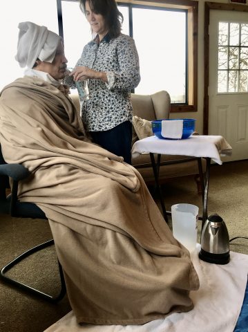 Cover the individual and the foot tub with a sheet and blanket to prevent chilling, being careful not to let the sheet fall in the water. If the individual begins to feel hot, place a cool washcloth over the forehead to keep the head from overheating. Refresh and replace as often as needed. The individual may also need water to drink, with a straw if easier while lying down, to replace fluid lost during sweating. As mentioned above, once the footbath is finished, lift the feet up out of the water, pour the cold water over them, then dry thoroughly and put warm socks on to prevent chilling.