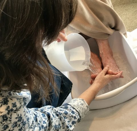 If done while lying down on a bed or other surface, you may want to drape the area with a piece of plastic, covered by a sheet. This will protect the mattress or surface from water drips and from the patient’s potential sweating. Lay a towel across the foot of the bed and set the foot tub on it. Fill with warm water about half to three quarter full. Have the individual lie down on their back, and with knees bent, rest their feet in the tub. Gently lower the feet in, to test that the water is not too hot. If too warm, add a bit of cool water. If not warm enough, add some hot water.
